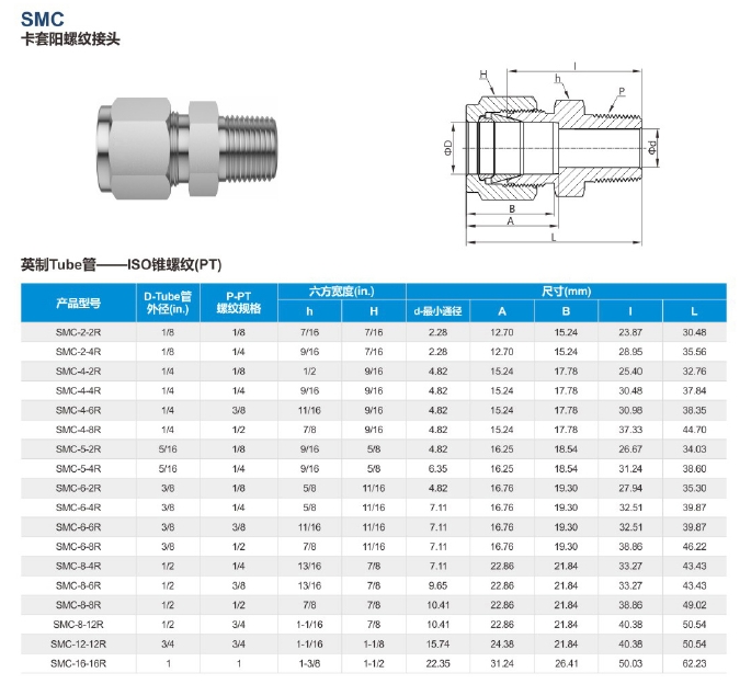 外螺纹卡套接头-英制TUBE管转ISO锥螺纹/PT 特点:一端为英制卡套,一端为PT外螺纹,默认材质为316L,可定制加工特殊材质。 PT螺纹卡套接头的主要应用 凭借其耐高压、耐腐蚀、密封可靠