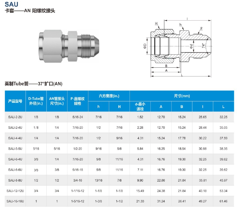 特点:用于连接卡套管与AN螺纹接口的流体连接元件。该接头采用双卡套设计,可在无需焊接的情况下与卡套管实现密封连接,另一端则为符合AN(Army-Navy)标准的37°扩口阳螺纹,常用于液压系统、燃油管路及仪器仪表等应用场景。 安装注意事项